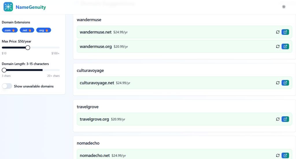 Namegenuity is an AI-driven domain name generator designed to help creators, marketers, and entrepreneurs find usable, brand-friendly domain ideas quickly.